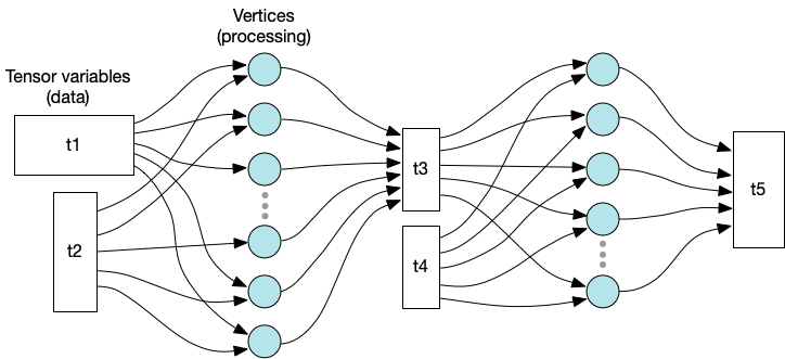 A Poplar computation graph defines the input/output relationship between variables and operations. Each variable is a multi-dimensional tensor of typed values and can be distributed across multiple tiles.
