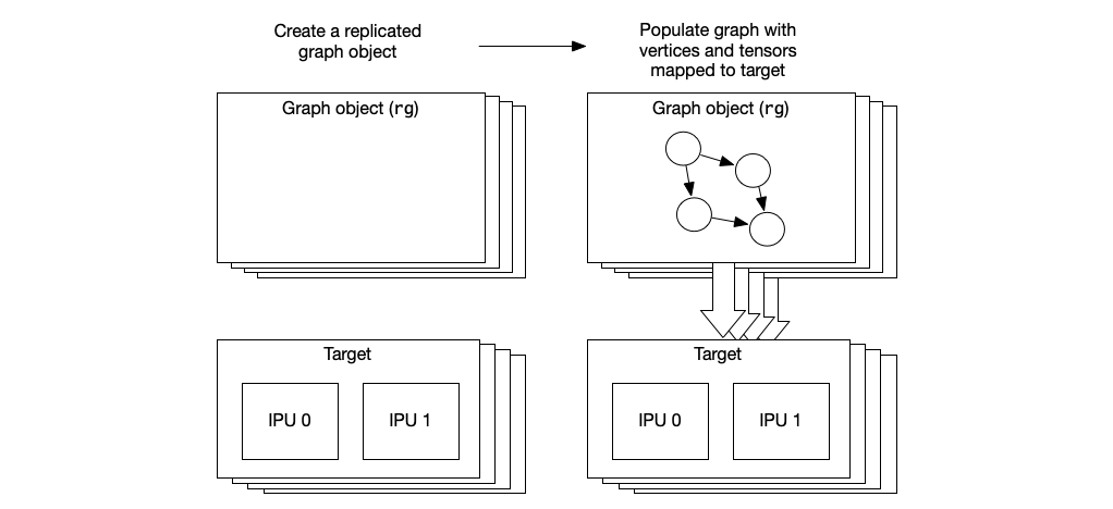 You can also create a replicated graph. This effectively creates a number of identical copies, or replicas, of the same graph. Each replica targets a different subset of the available tiles (all subsets are the same size). This may be useful, for example, where the target consists of multiple IPUs and you want to create a replica to run on each IPU (or group of IPUs) in parallel.
