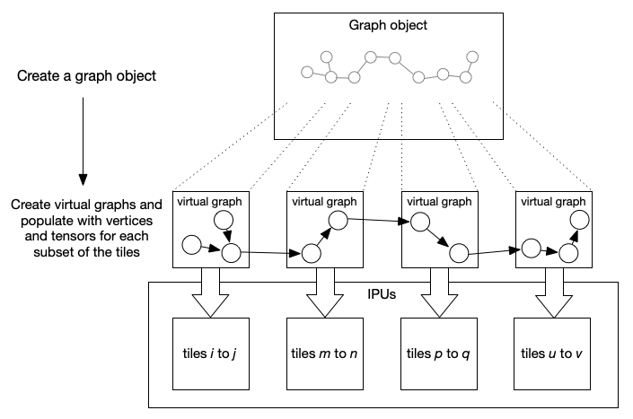 A graph is created for a target device with a specific number of tiles. It is possible to create a new graph from that, which is a virtual graph for a subset of the tiles. This is effectively a new view onto the parent graph for a virtual target, which has a subset of the real target’s tiles and can be treated like a new graph. You can add vertices and tensors to the virtual sub-graphs. These will also appear in the parent graph.
