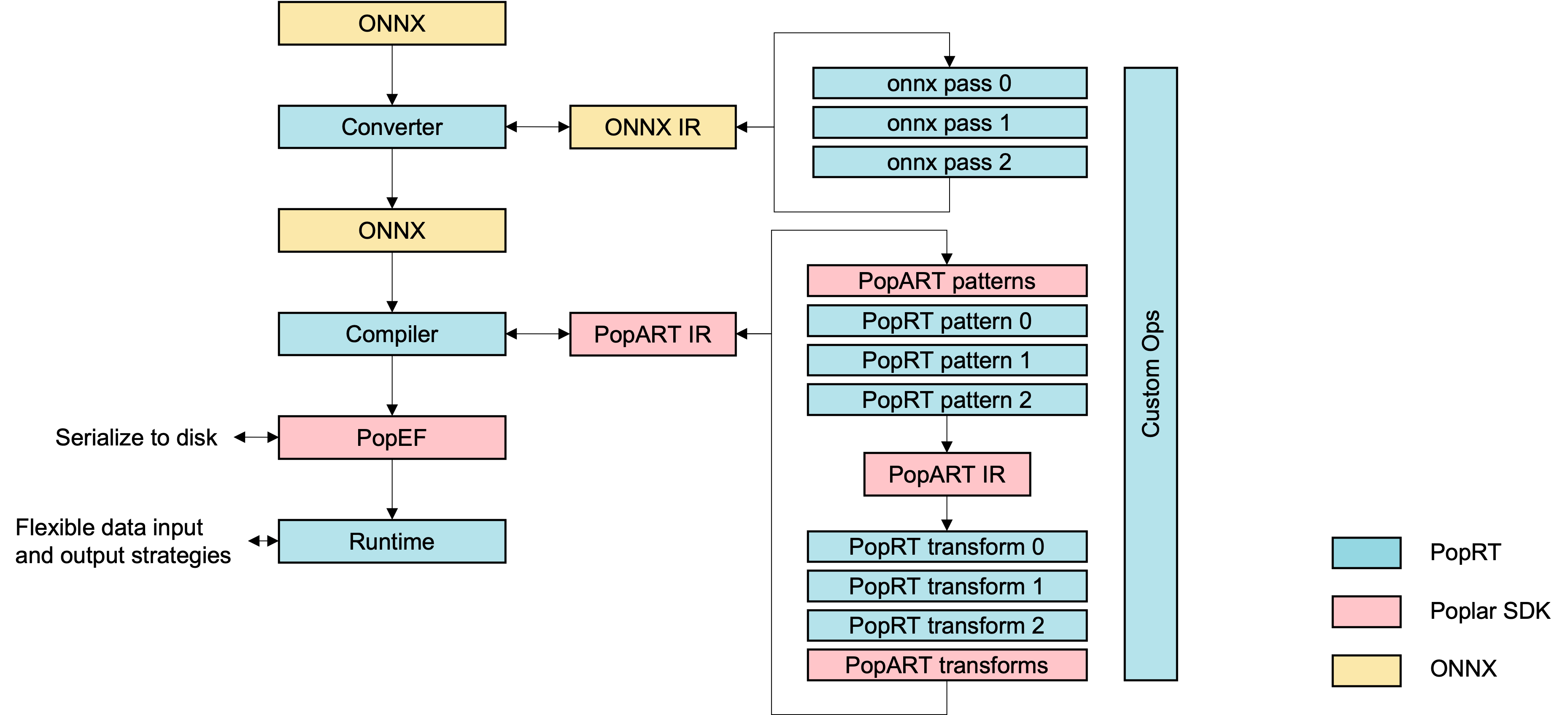 • Compiler: Optimises the PopART IR for inference and includes patterns and transforms. The serialisable binary PopEF model is generated after compilation.