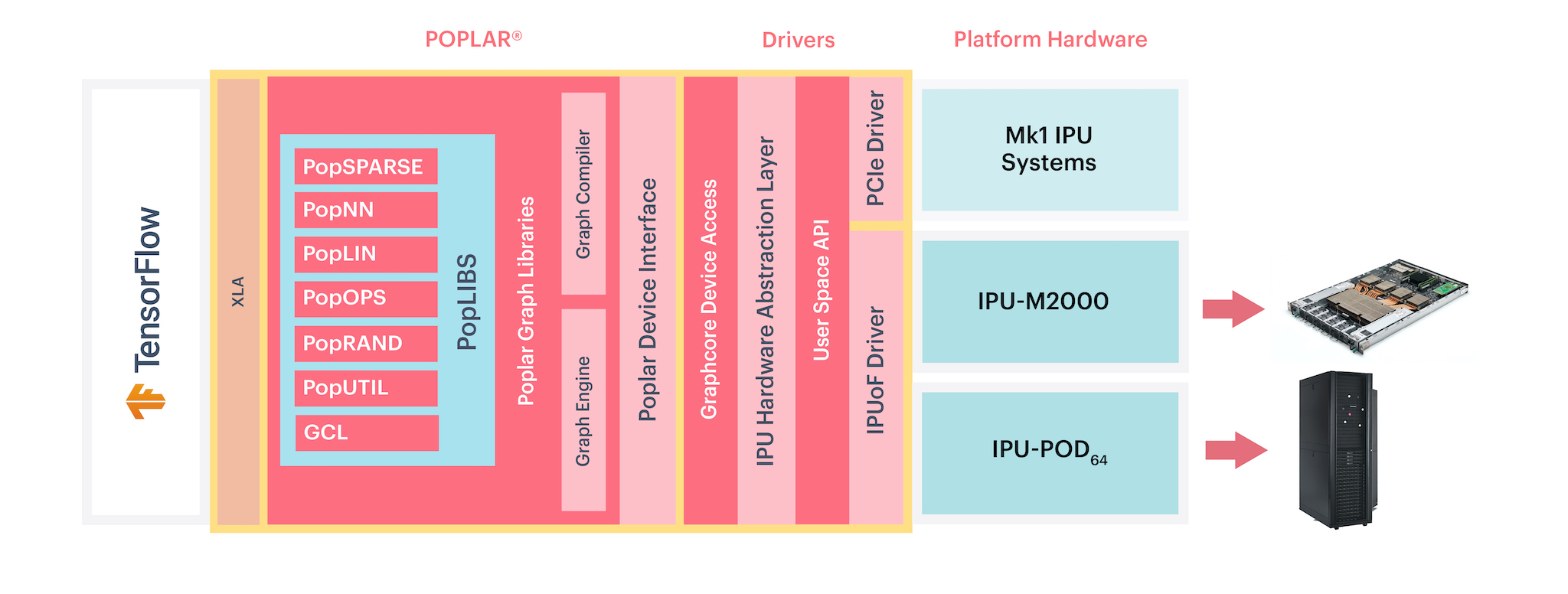 TensorFlow is a powerful graph-modelling framework that can be used for the development, training and deployment of deep learning models. In the Graphcore software stack, TensorFlow sits at the highest level of abstraction. Poplar and PopLibs provide a software interface to operations running on the IPU. XLA (Accelerated Linear Algebra) is a domain-specific compiler for linear algebra that can accelerate TensorFlow models. TensorFlow graphs are compiled into Poplar executables using our XLA backend.