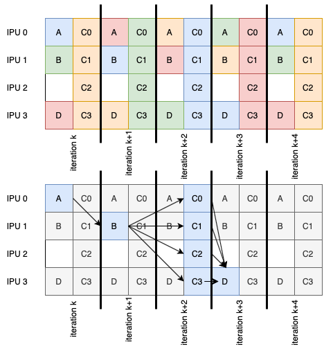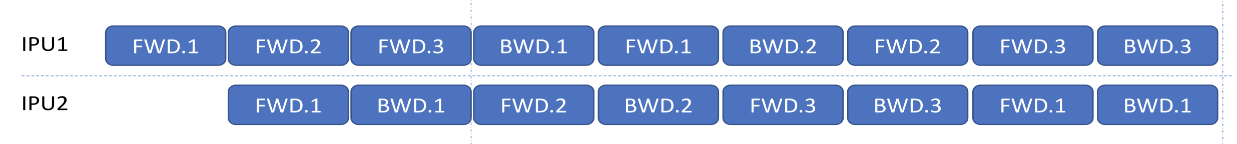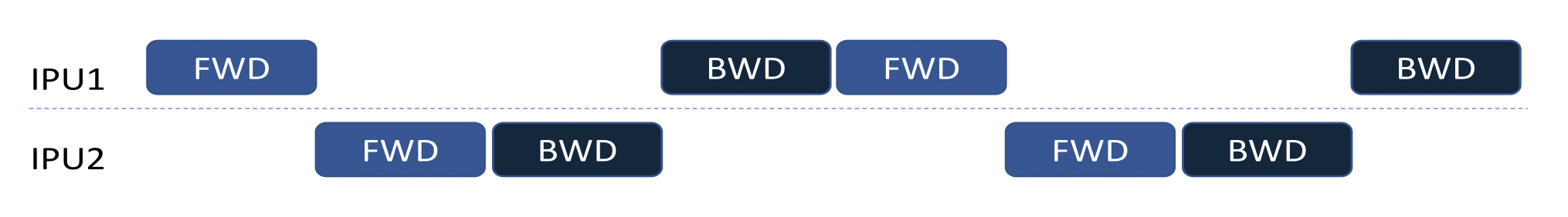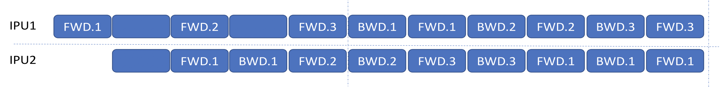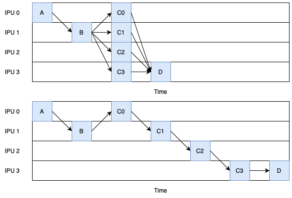 Comparing this to a pipeline not using this feature where the activations are passed through stages, the pipeline is shorter. This means that fewer activations are stored over the whole execution of the pipeline and the expected latency is lower than the serialised pipeline.